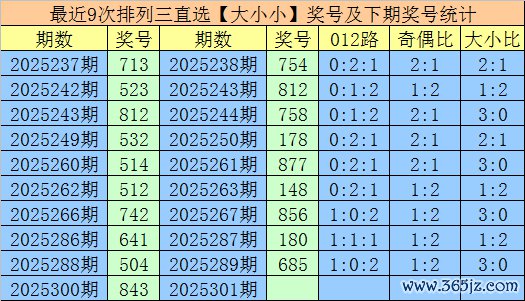 1.成列三第2025300期奖号开出843,大小直选散播为:大小小,在历史开奖中直选【大小小】散播已开出945期,在前9次直选【大小小】散播中,出现奖号为:713-523-812-532-514-512-742-641-504,齐是组六。