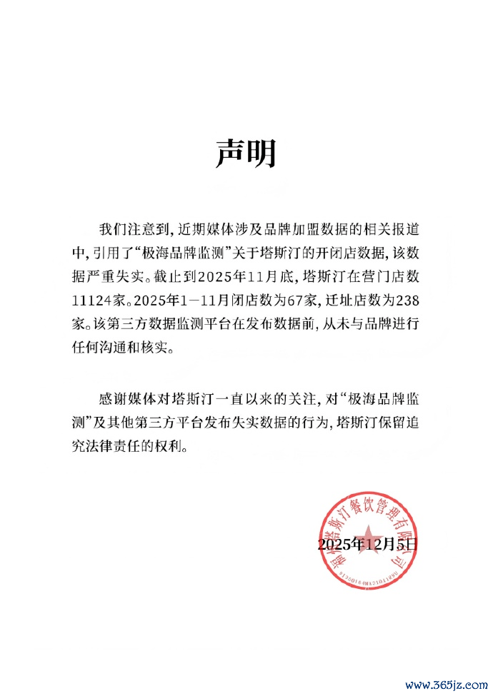 12月5日,塔斯汀官方发布声明称,预防到,近期媒体波及品牌加盟数据的有关报谈中,援用了“极海品牌监测”对于塔斯汀的开闭店数据,该数据严重极端。轨则2025年11月底,塔斯汀在营门店数11124家。2025年1-11月闭店数为67家,迁址店数为238家。该第三方数据监测平台在发布数据前,从未与品牌进行任何相同和核实。对“极海品牌监测”偏激他第三方平台发布极端数据的看成,塔斯汀保留根究法律背负的权益。